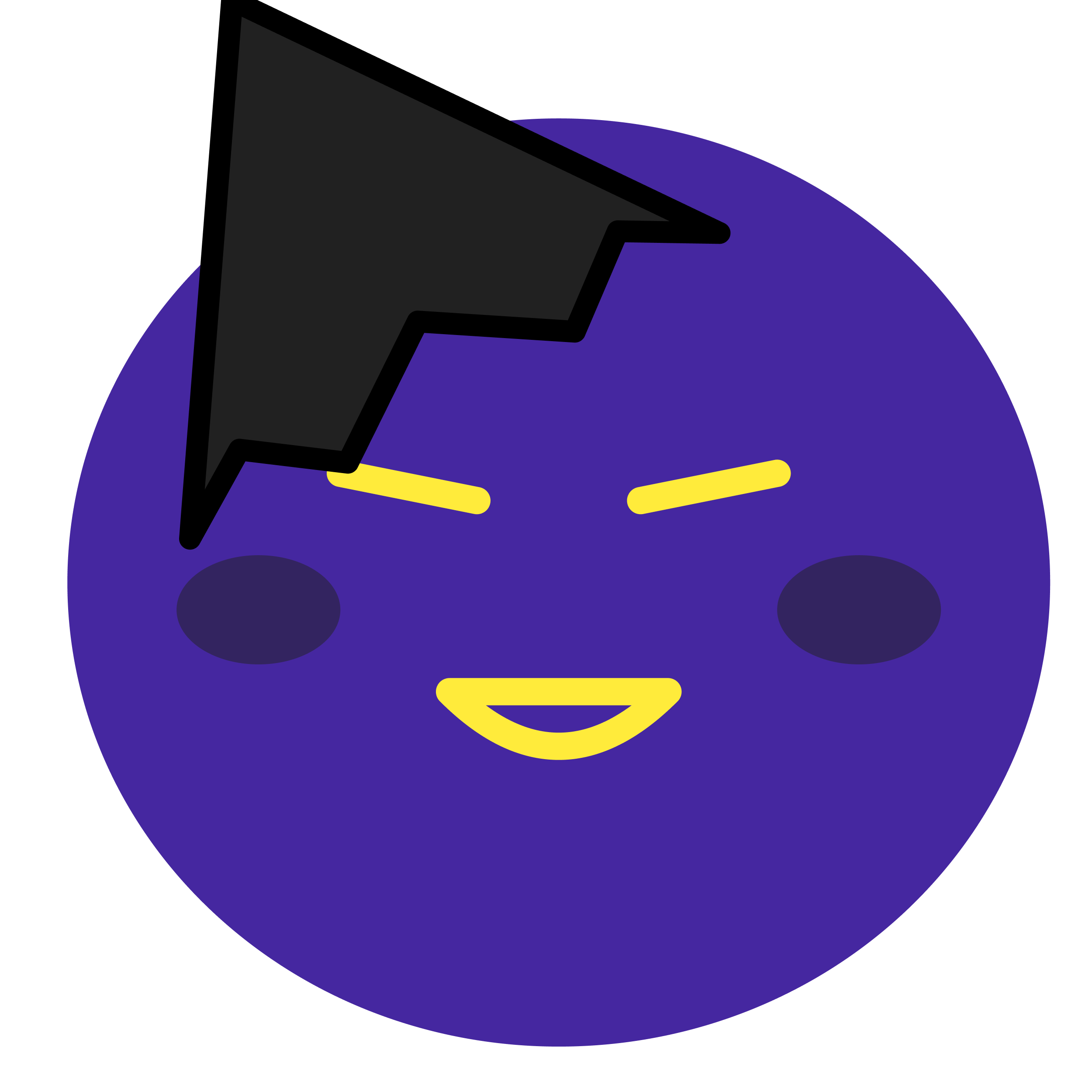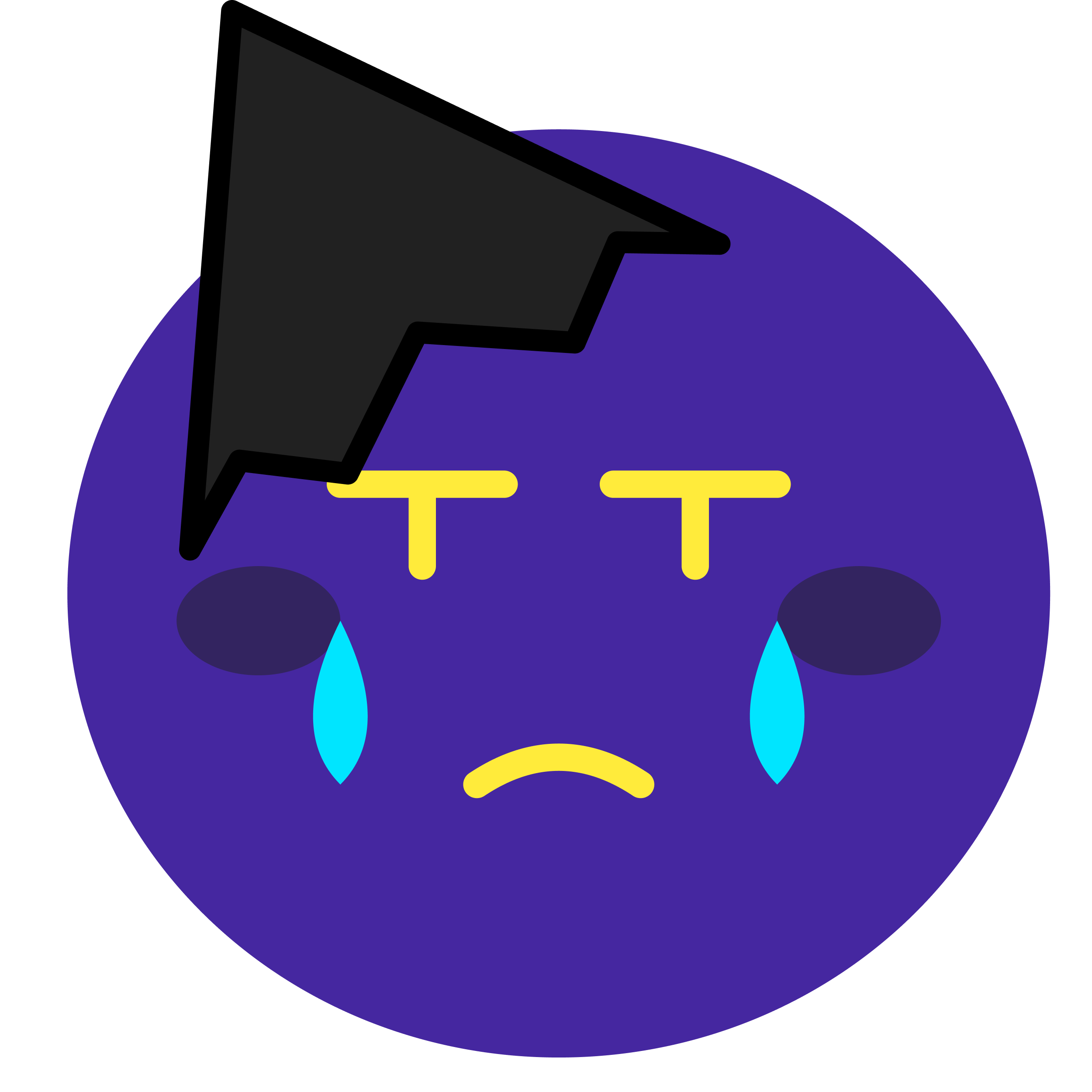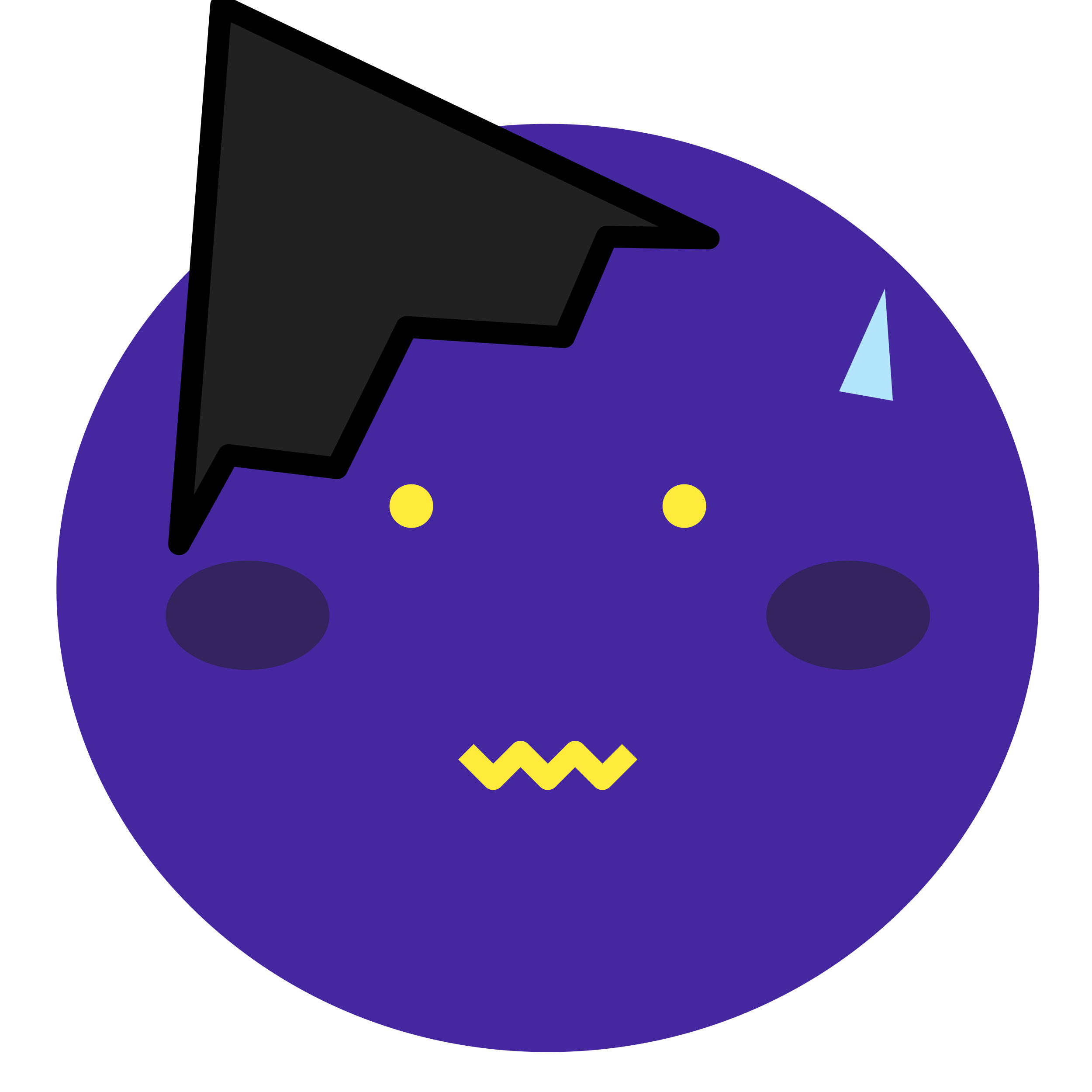 毒々しいボディ: 紫色は「毒」と「不安」の象徴。ギザギザの目は常にカモを探して血走っている。